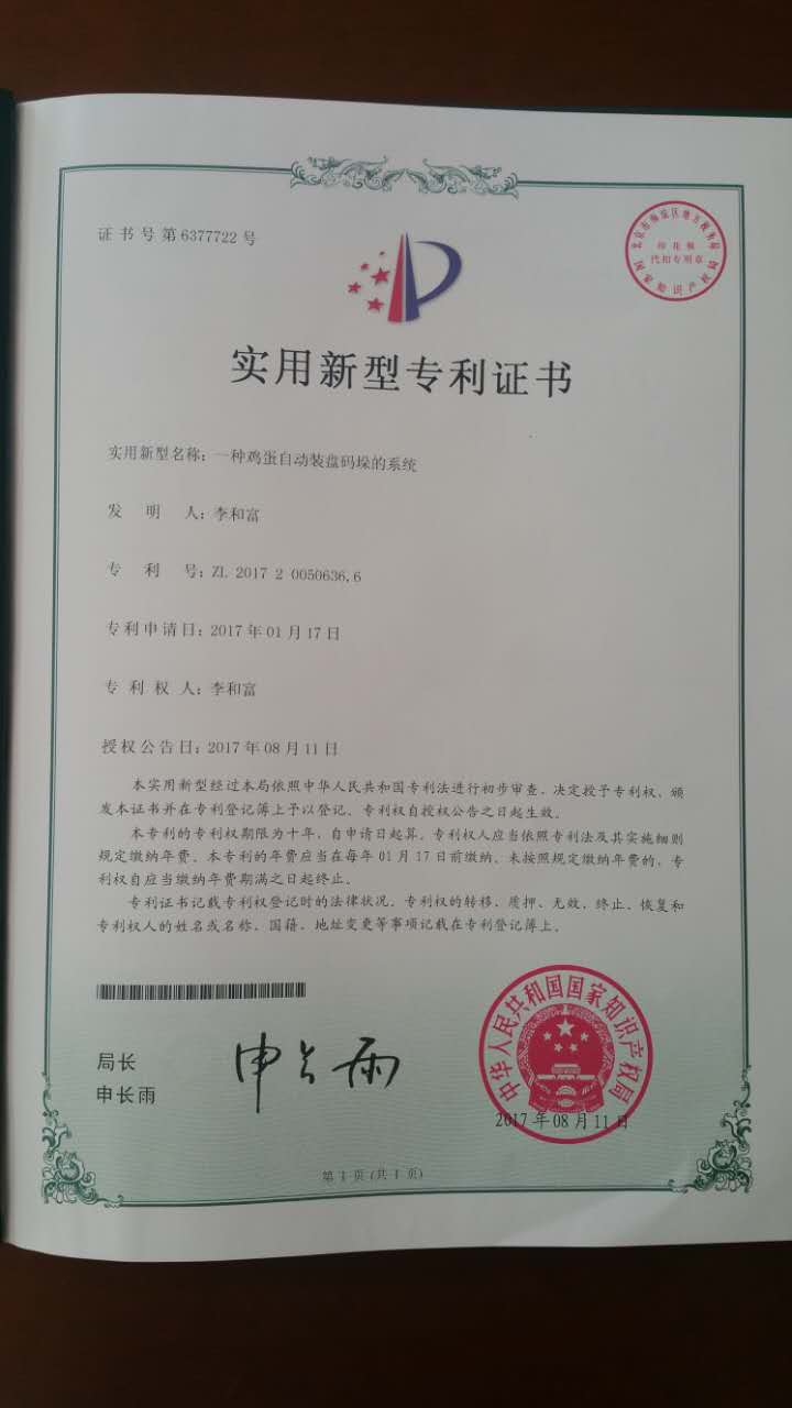 繼自動集蛋機、雞蛋自動分級機專利之后,最近兩年來,我公司工程師們在總經理李和富的帶領下,不斷突破技術上難關,成功研制出雞蛋自動裝盤碼垛機,并取得國家使用新型專利,這代表著我公司在自主創新的道路上又邁出一個新的臺階。