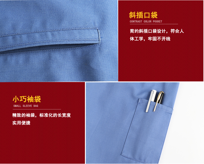 工作服的上衣左口袋主要是考慮插筆或做一些工號口袋使用,右口袋有考慮放手機(jī)或一些實用小物品,衣袖上的筆袋是考慮在工作時做一些記入時要用的筆可以放,所以袖袋也可以根據(jù)工作要求,做一些適合工作需要的筆袋,下面兩口袋主要考慮實用性的,另外還可以根據(jù)工作需要多做或少做一些口袋,這主要根據(jù)各企業(yè)的工作環(huán)境和要求制作。工作服的胸口口袋最好采用直插口袋,然后做口袋蓋,這樣可以有效防止工作中口袋里有物品掉出,影響工作和產(chǎn)品質(zhì)量,所以一些不實用的口袋,對工作服來說最好不做,以免員工在使用中影響工作。