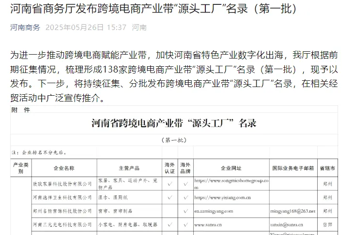 2025 年 5 月 26 日,河南省商務廳正式發布第一批河南省跨境電商產業帶 “源頭工廠” 名錄,河南天曼服飾有限公司成功入選,成為全省服裝行業跨境電商領域的標桿企業。