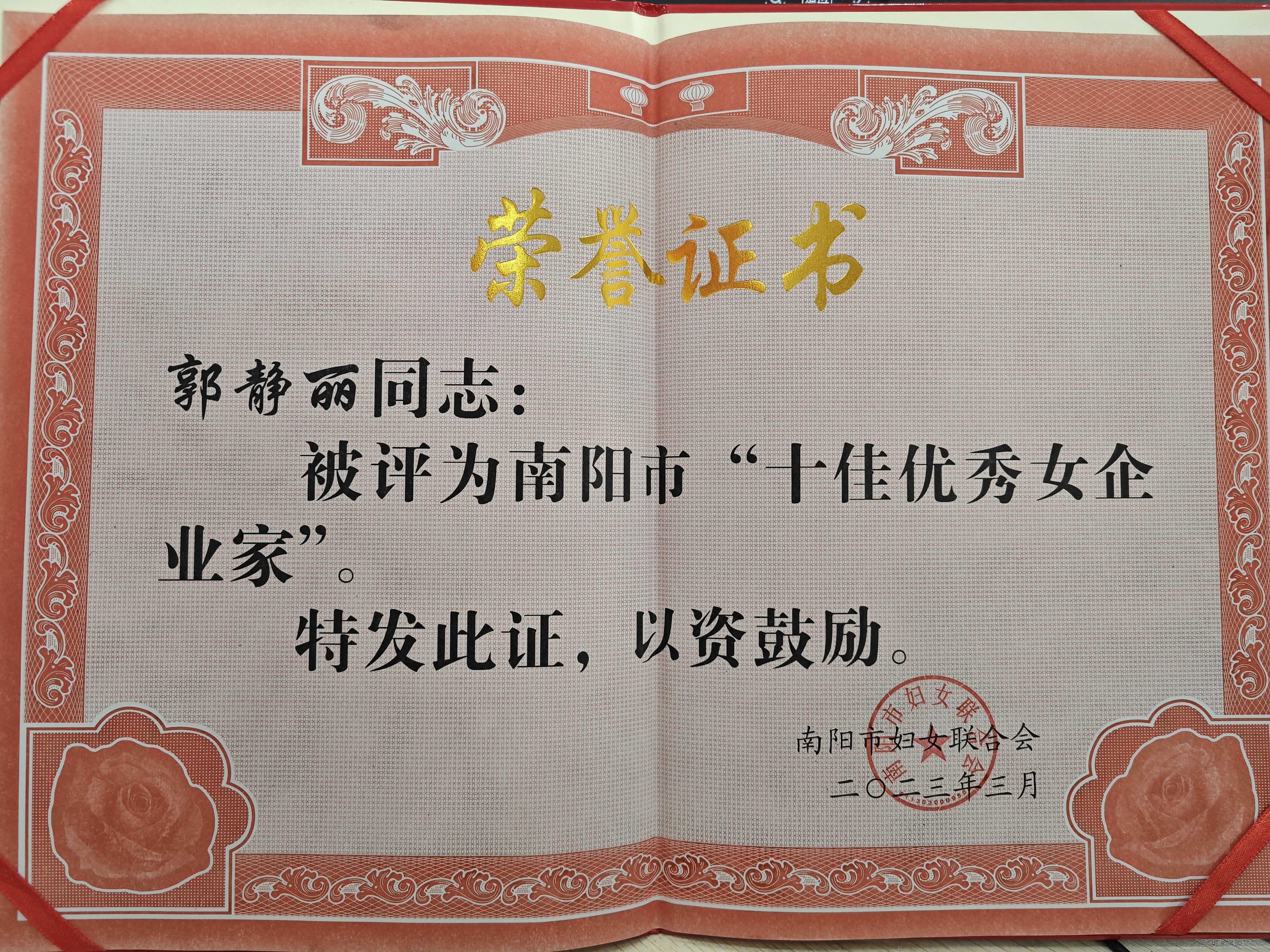 2023年3月7日,南陽市市委、市政府、市婦聯(lián)隆重舉行“三八節(jié)”表彰大會(huì),郭靜麗董事長榮膺“南陽市十大優(yōu)秀女企業(yè)家”榮譽(yù)稱號,這是所有河南天曼服飾家人的榮耀,是激勵(lì)河南天曼服飾踔厲前行的號角!