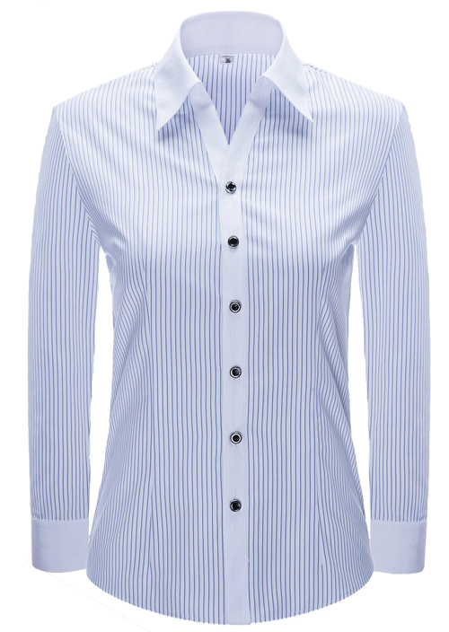 品名:女長袖v領(lǐng)襯衣;版型:修身版;貨號:YW3006 ;面料:Y3006;顏色:藍(lán)色寬細(xì)堅條 ;Fabric:C30/T48/TS22