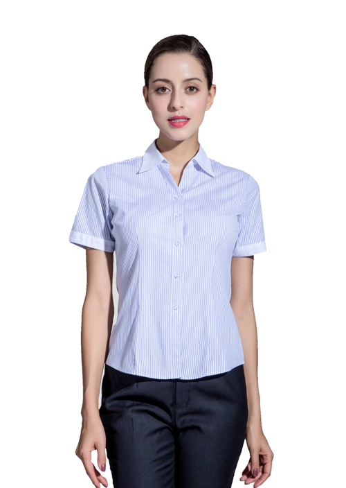 • 產品簡介:品名:女短袖V領襯衣;版型:修身版;貨號:TWD6001 ;面料:T6001;顏色:藍豎條紋白領白袖口 ;Fabric:C60/T40/80/2*45S