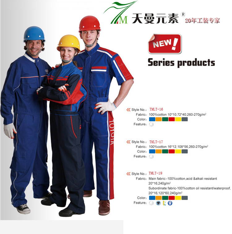 - 產品簡介:產品詳細描述 : TMLT-16 面料:100% 純棉,10*10,72*40,260-270 GSM;前胸繡花汽車品牌標志,前門襟樹脂拉鏈,兩個帶蓋胸兜和兩個斜插褲兜,后背臀部貼兜,腿部工具兜,腰部松緊帶 TMLT-17 面料:100% 純棉,16*12,108*56,260-270 GSM;前胸繡花標志,前門襟樹脂拉鏈,兩個帶蓋胸兜和兩個斜插褲兜,后背臀部貼兜,腿部工具兜,腰部松緊帶 TMLT-18 面料:100% 純棉,20*16,240 GSM,防酸,防堿;腿部TOYOTA繡花標志,前門襟樹脂拉鏈,兩個帶蓋胸兜和兩個斜插褲兜,后背臀部貼兜,腿部工具兜,腰部松緊帶,腰部魔術貼可以調節(jié)松緊。
