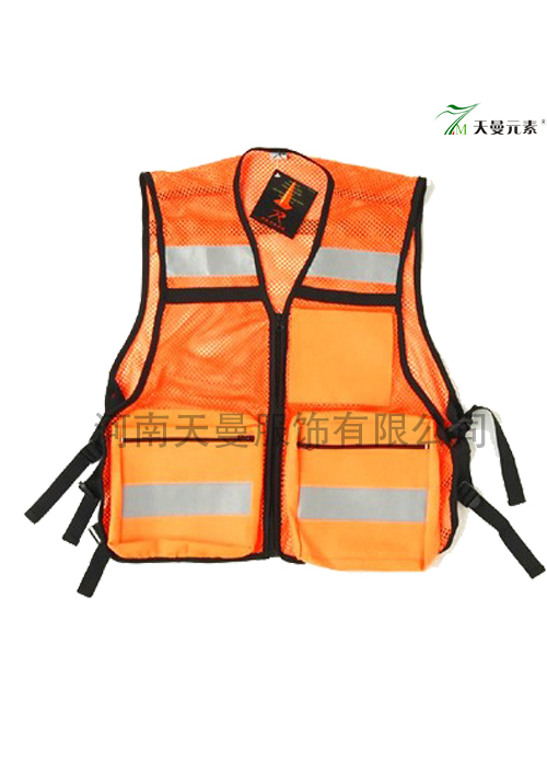 面料:100%純滌綸,配料為桔黃色網眼布,胸前有反光條,下擺兜有二條反條,下兜有兩條尼龍拉鏈,馬甲邊上有黑色邊布。