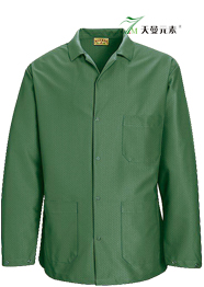 防靜電涂層布料:98% 棉,2% 尼龍;前門襟5個塑脂扣,袖口各兩個塑脂扣;